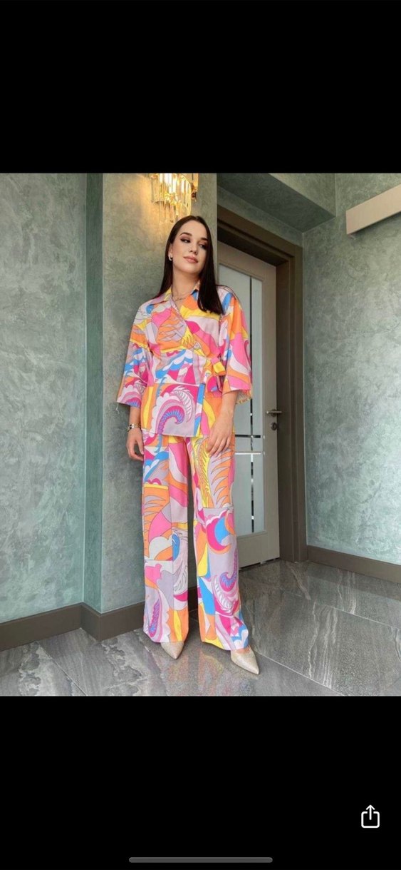 Uzun kollu, salaş kesim kadın takımı, yumuşak ve parlak kumaştan. Pastel tonlarda çok renkli batik desenli, günlük kullanıma uygun.