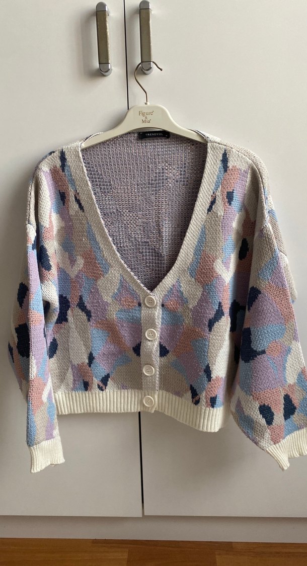 Renkli batik desenli, bol kesim ve uzun kollu triko hırka. Rahat örgü kumaştan, V yaka ve normal uzunlukta, günlük kullanıma uygun.