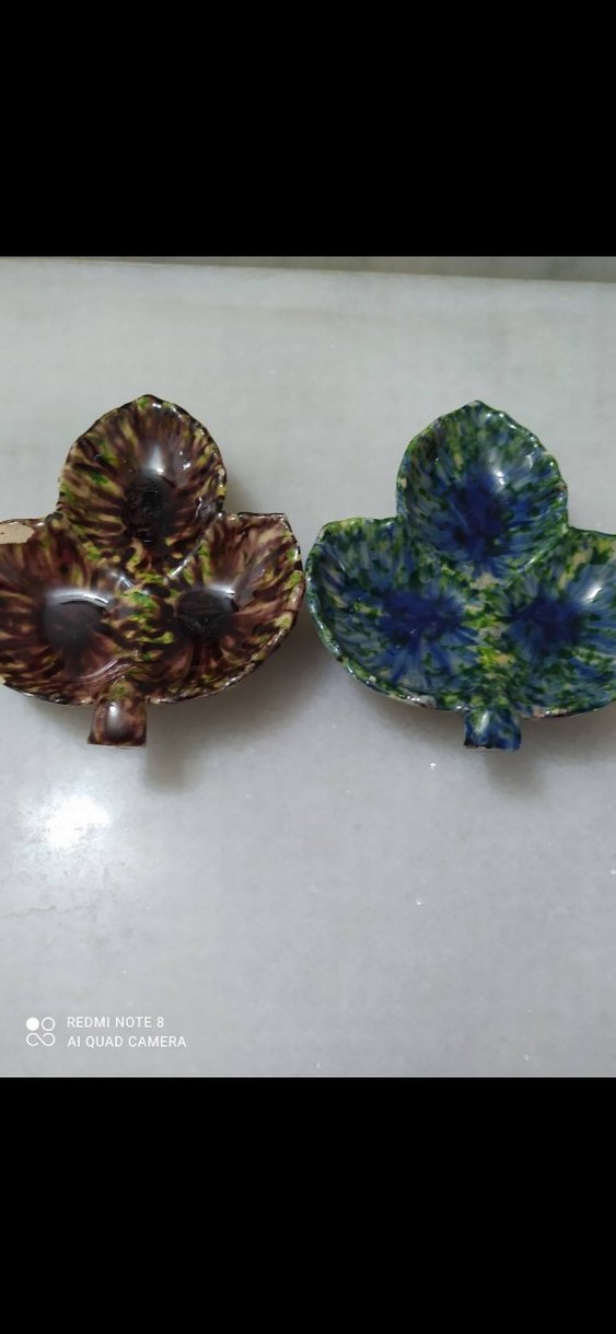 İki adet çok renkli, koyu batik desenli yaprak şeklinde tabak seti, servis veya dekorasyon için uygundur.