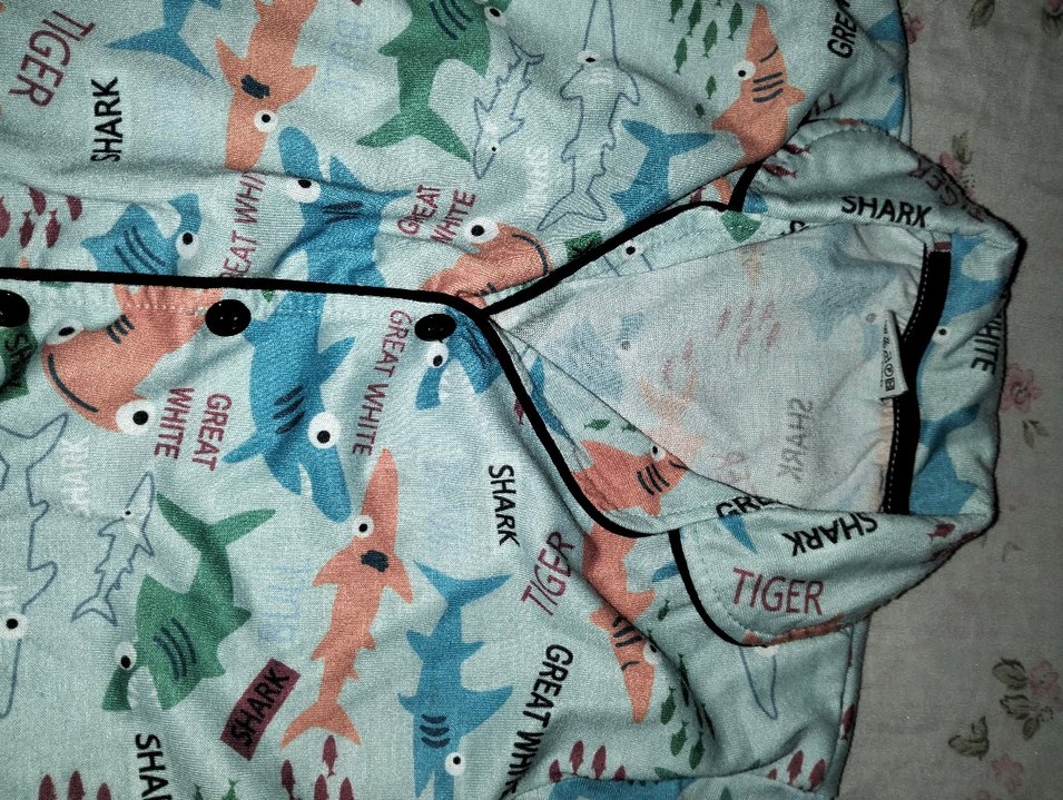 Renkli batik desenli yoga kayışında köpekbalığı figürleri ve 'SHARK', 'GREAT WHITE', 'TIGER' yazıları yer alıyor.