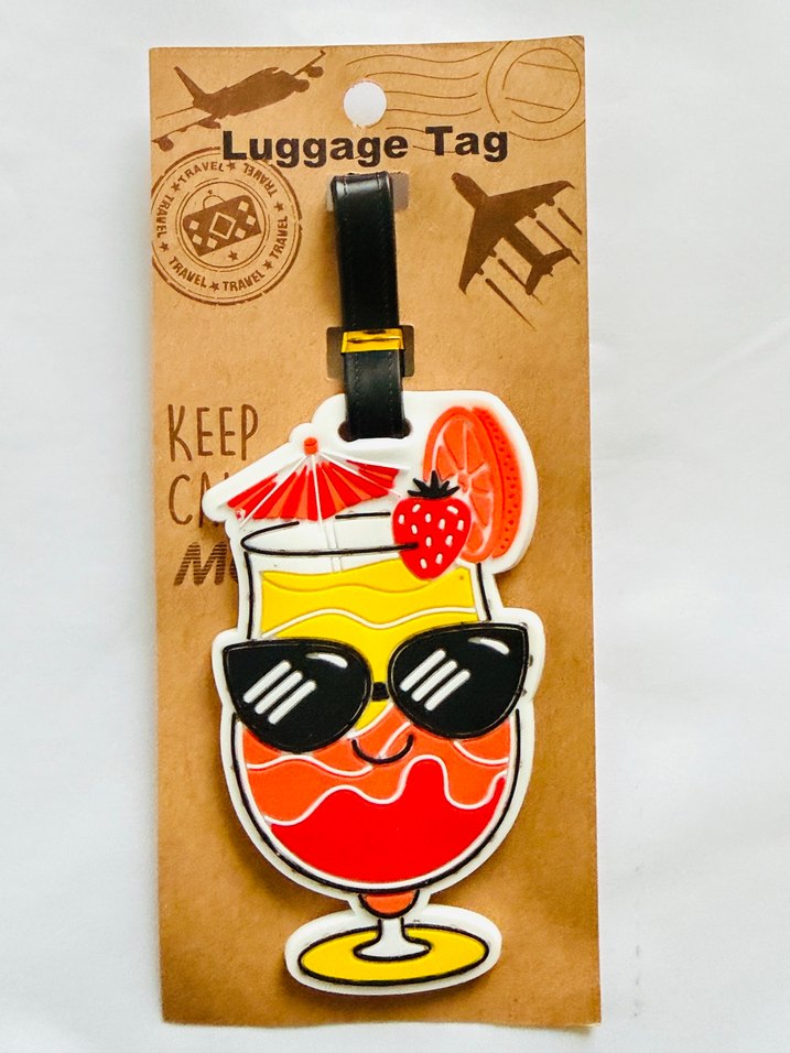 Canlı renklerde, gözlük ve meyve detaylı içecek tasarımlı bavul etiketi. Siyah kayışıyla kolayca takılır.