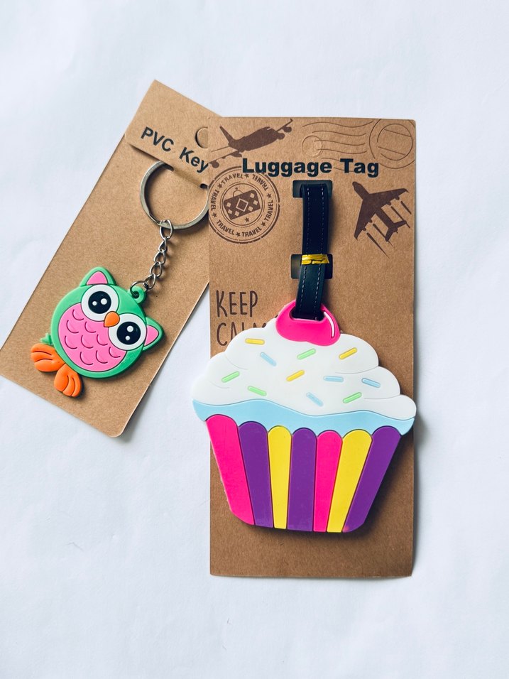 Renkli baykuş anahtarlık ve cupcake şeklinde bavul etiketi seti. çok renkli tasarım içerir.