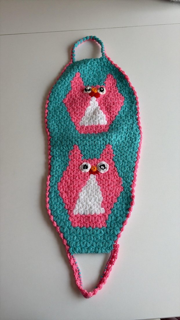 Baykuş desenli, renkli banyo süngeri. Kullanımı kolay tutma sapı bulunur. Pembe, beyaz ve turkuaz renkler içerir. banyo lifi. El örmesidir en kaliteli ipliklerle örülmüştür.