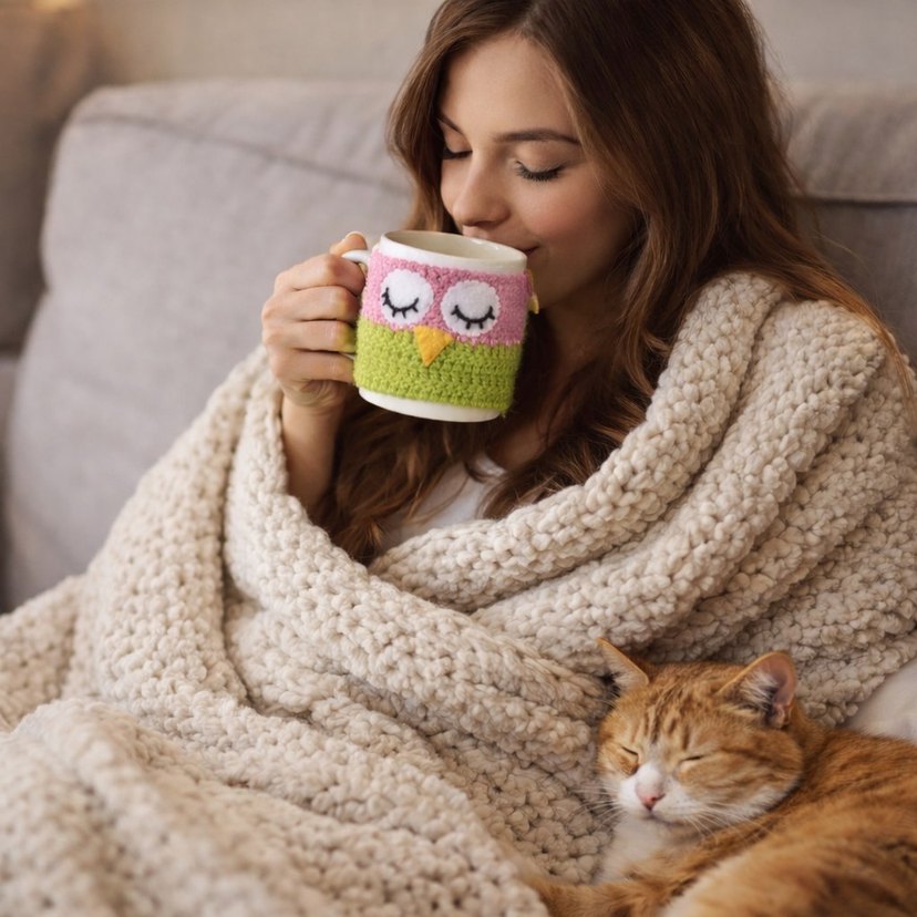 Renkli baykuş desenli örgü kupa kılıfı, kupanıza şıklık ve sıcaklık katar.