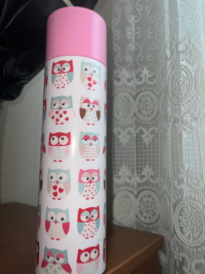 Pembe renkte, renkli baykuş desenli termos, içecekleri sıcak tutar. Canlı ve eğlenceli tasarıma sahiptir.