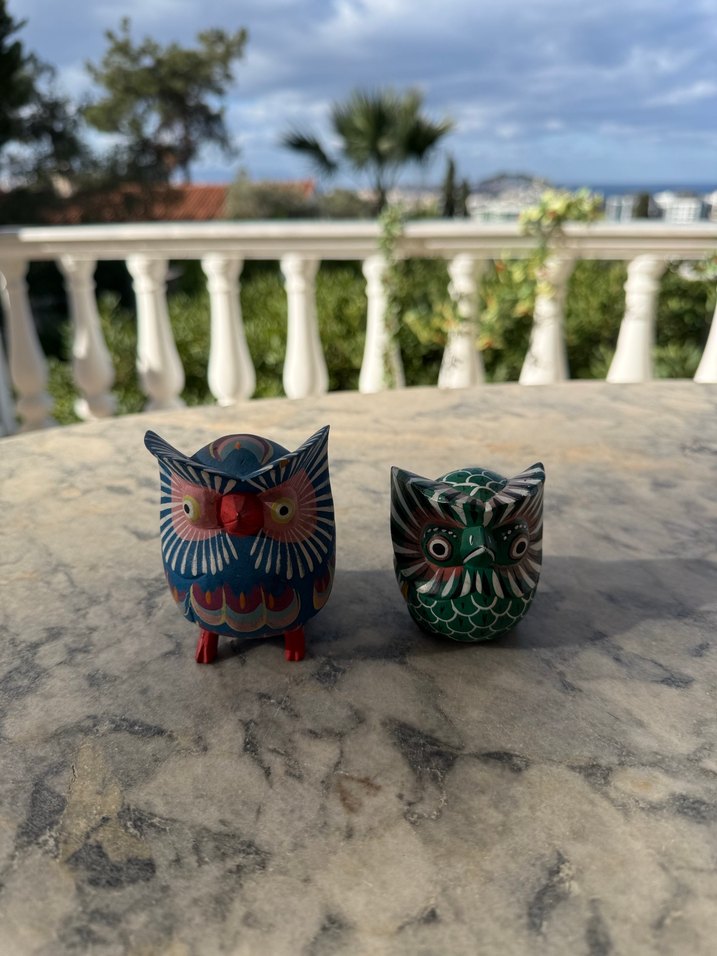 Detaylı desenlere sahip iki renkli baykuş figürini, dekoratif amaçlı kullanıma uygundur.