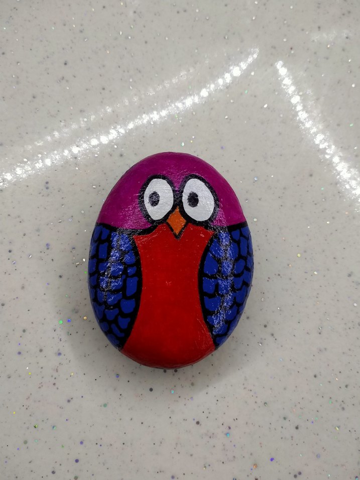 Canlı kırmızı, mavi ve mor tonlarda boyanmış, pürüzsüz taş üzerine renkli baykuş figürü.