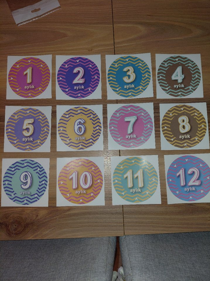 1'den 12'ye kadar numaralandırılmış, renkli ve desenli bebek aylık etiketleri seti. İlk yaşında her ay fotoğraf çekmek için uygun. Gelecek için mükemmel anı. Ben de aynısından iki tane olduğu için satılık. Kullanılmadı.