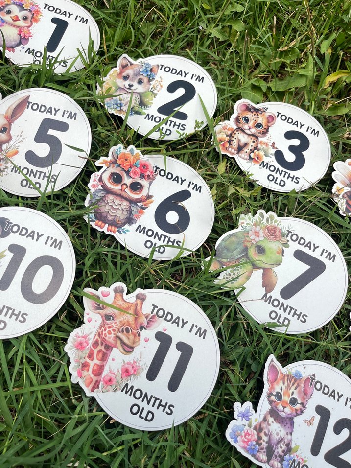 Sevimli hayvan figürlü, 1-12 ay arası renkli bebek ay kartları seti. Fotoğraf anıları için uygun. Sıfır üründür
