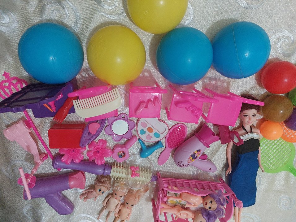 Pembe saç fırçaları, saç kurutma makinesi, aynalar, küçük bebekler ve oyun toplarından oluşan renkli oyuncak seti.