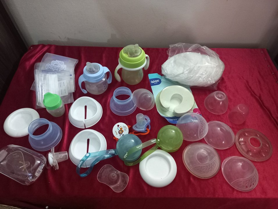 Beyaz ve renkli parçalar içeren çeşitli biberon, emzik, kulplar ve aksesuarlar içeren bebek biberon seti.