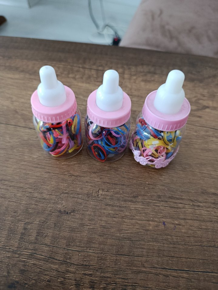 Üç adet pembe kapaklı, renkli lastik bantlarla dolu bebek biberonu. 3 adettir