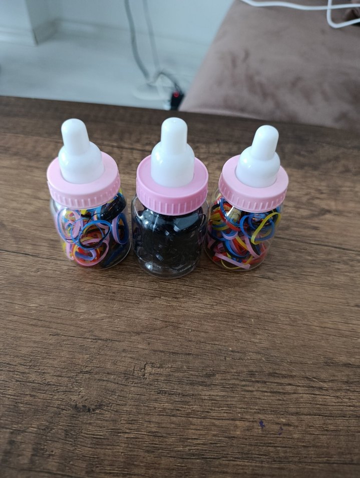 Üç küçük bebek biberonu, pembe kapaklı, içinde renkli lastik bantlar bulunuyor. Küçük eşyaları düzenlemek için kullanışlı. 3 adettir