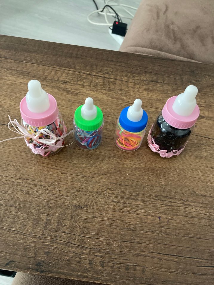 Pembe, yeşil ve mavi kapaklı renkli bebek biberonları, çeşitli küçük eşyalarla dolu. Canlı ve eğlenceli tasarım. 4 adettir