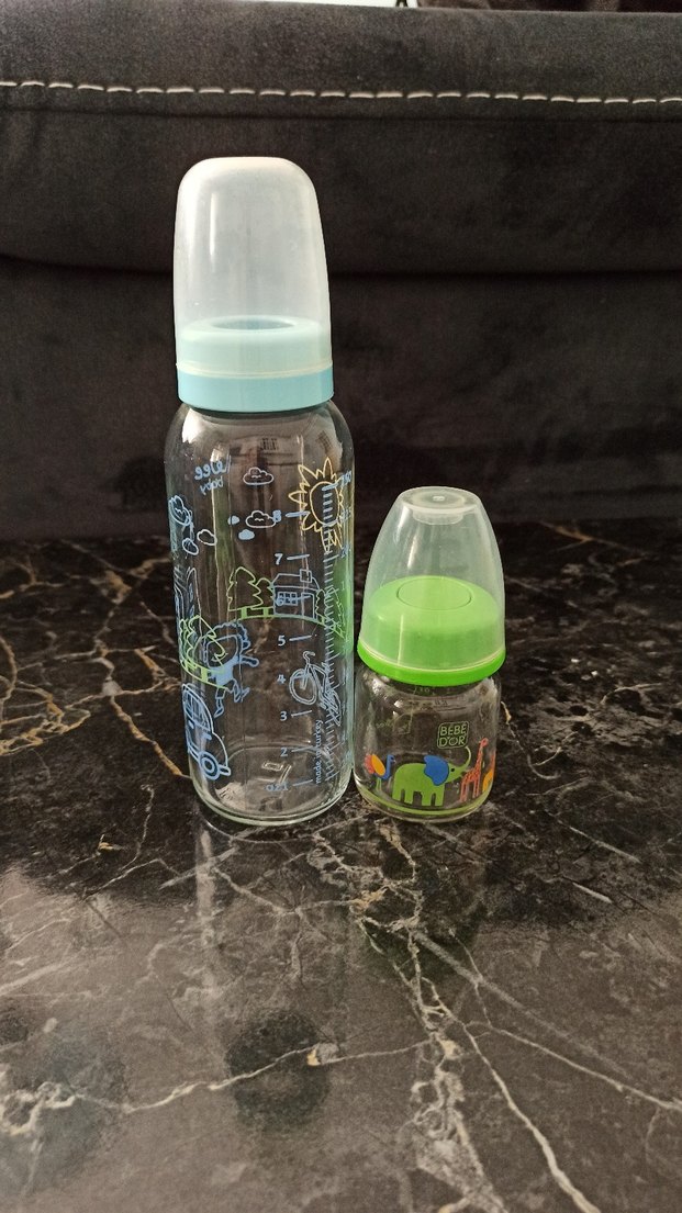 Ölçü işaretli, koruyucu kapaklı iki renkli bebek biberonu seti. Biri mavi kapaklı büyük, diğeri yeşil kapaklı küçük ve hayvan desenli.