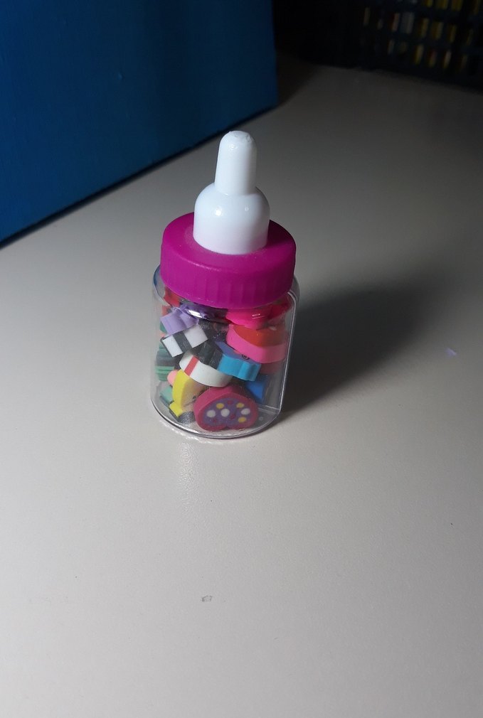 Pembe kapaklı, şeffaf bebek biberonu şeklinde küçük kutuda renkli minik objeler bulunur.