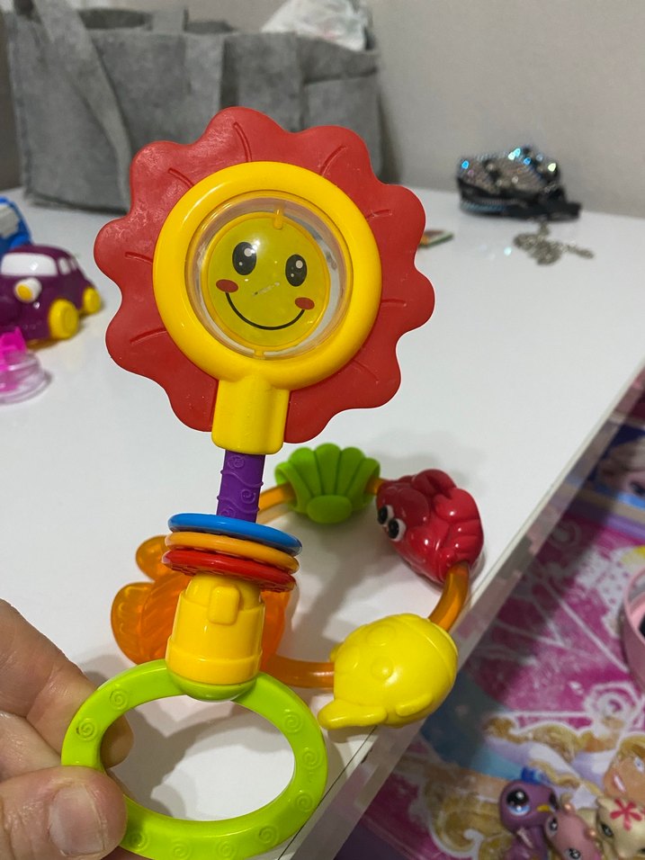 Gülümseyen güneş figürlü, dokunsal farklı parçaları olan renkli bebek diş kaşıyıcı ve çıngırak.