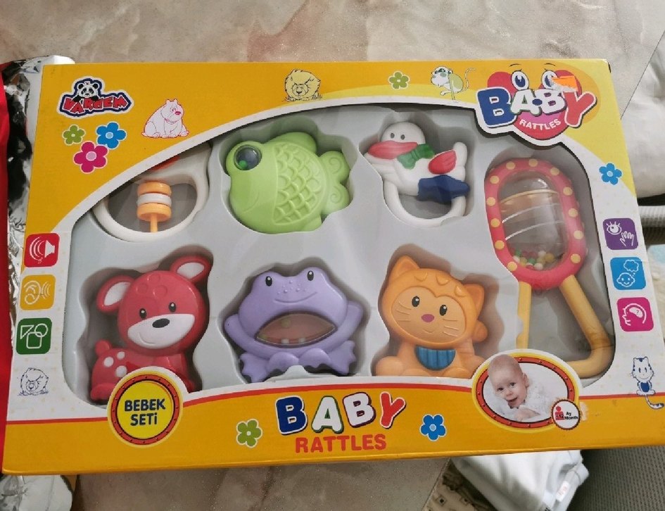 Renkli hayvan figürlü bebek diş kaşıyıcı ve çıngırak seti, bebeklerin ilgisini çekmek ve rahatlatmak için tasarlanmıştır.
