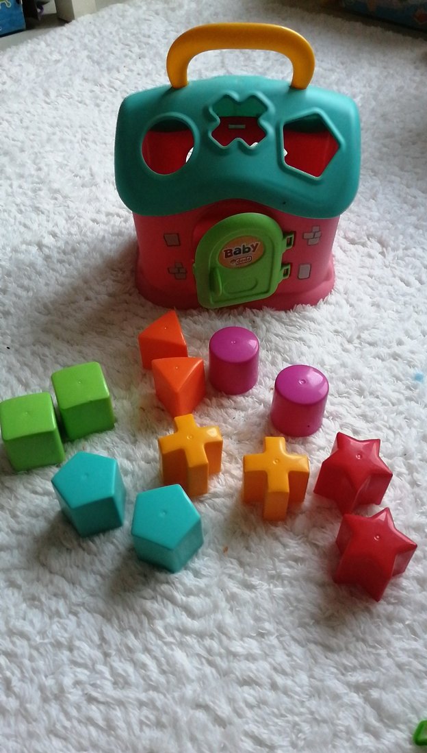 Renkli, ev şekilli eğitici oyuncak; farklı şekillerde delikler, yeşil kapı ve taşıma için sarı kulpa sahiptir.