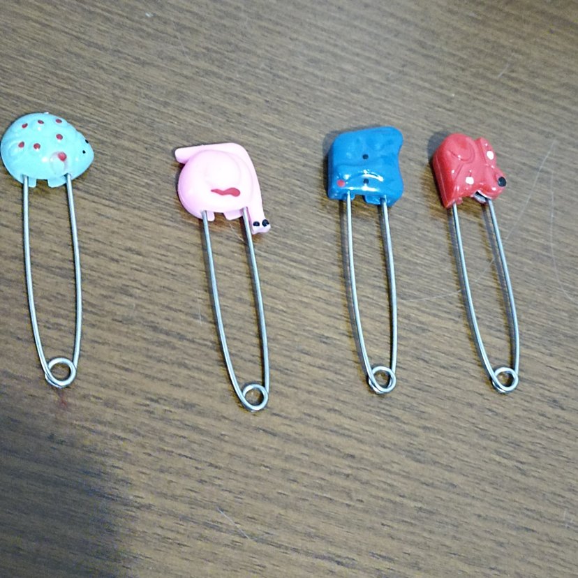 Renkli ve çeşitli hayvan figürlü başlıklara sahip, gebelik ve emzirme aksesuarı olarak kullanılabilen güvenlik iğneleri. Eşyaları güvenli ve şık tutar.