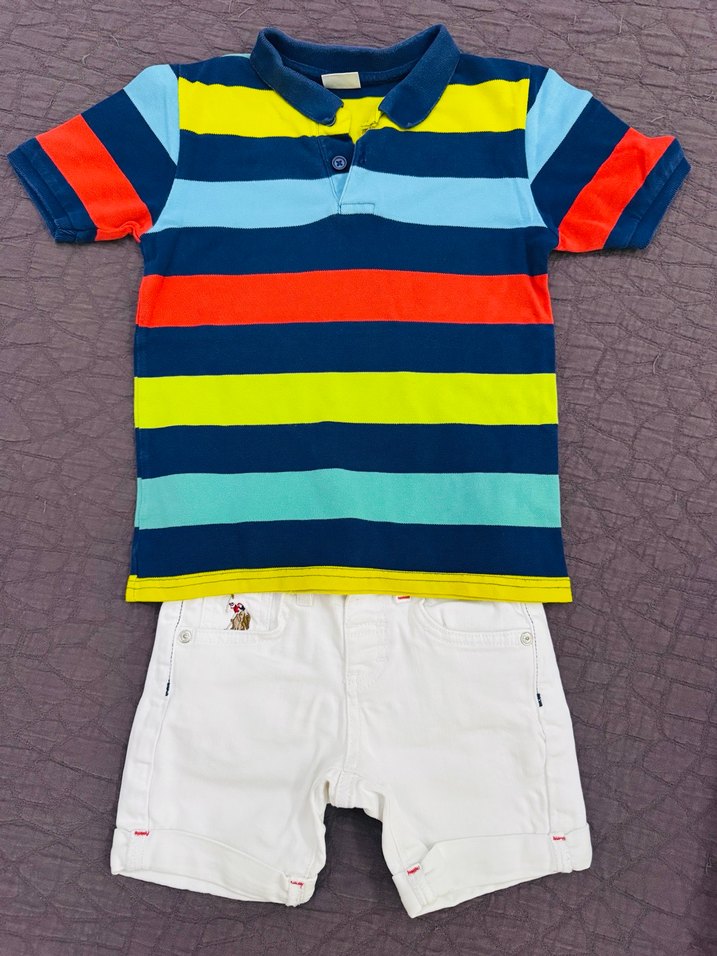 Renkli çizgili kısa kollu, düğmeli yakalı tişört ve beyaz şorttan oluşan pamuklu bebek erkek takımı. Rahat ve şık sokak stili.