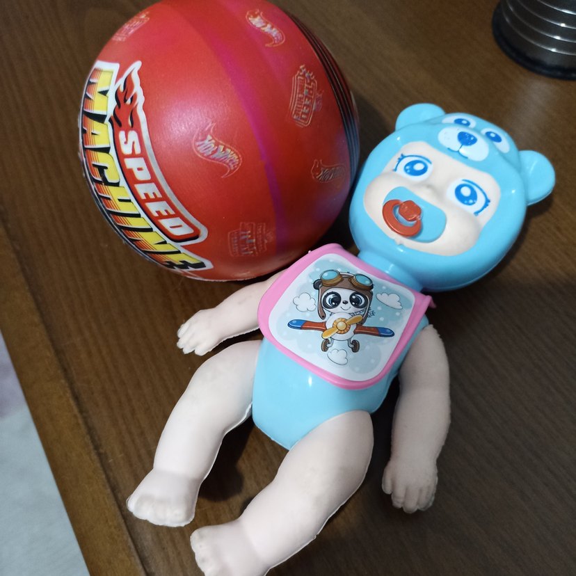 Renkli bebek figürlü oyuncak, mavi ayı şapkalı ve emzikli, pilot köpekli önlük takıyor, kırmızı 'Speed Machine' yazılı top ile birlikte.