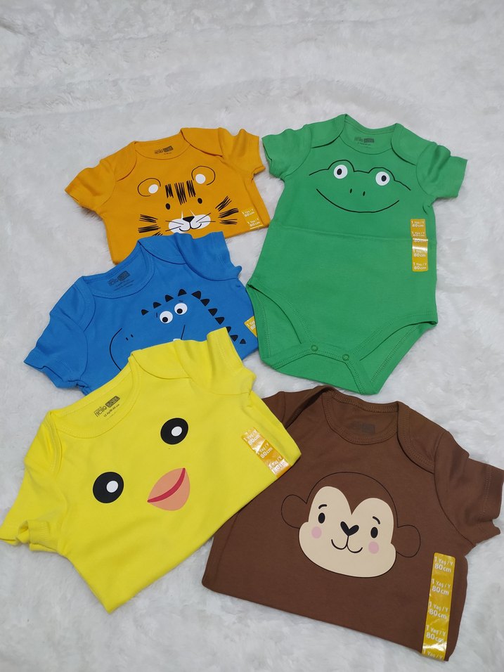Yumuşak ve sıcak kumaştan, hayvan yüzü baskılı renkli kısa kollu bebek body. Kolay giyim için crew yaka ve çıtçıtlı tasarım.