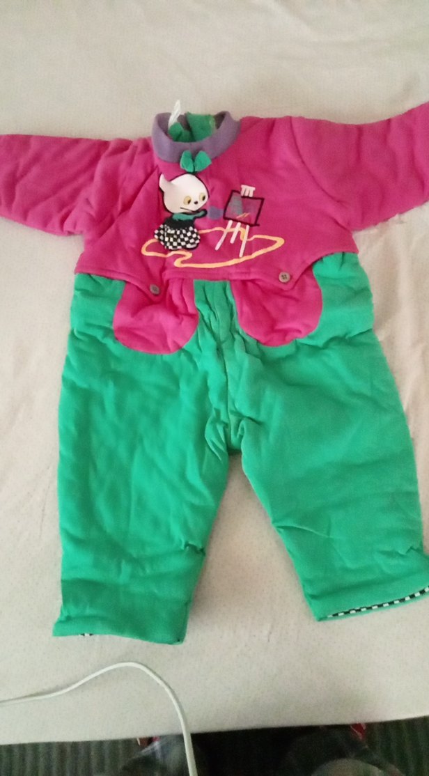 Renkli bebek kız tulumu, düğmeli ve yakası notched lapel. Üstünde sevimli bir karakter baskısı bulunur. Pembe ve yeşil renkler kullanılmıştır. ❄️