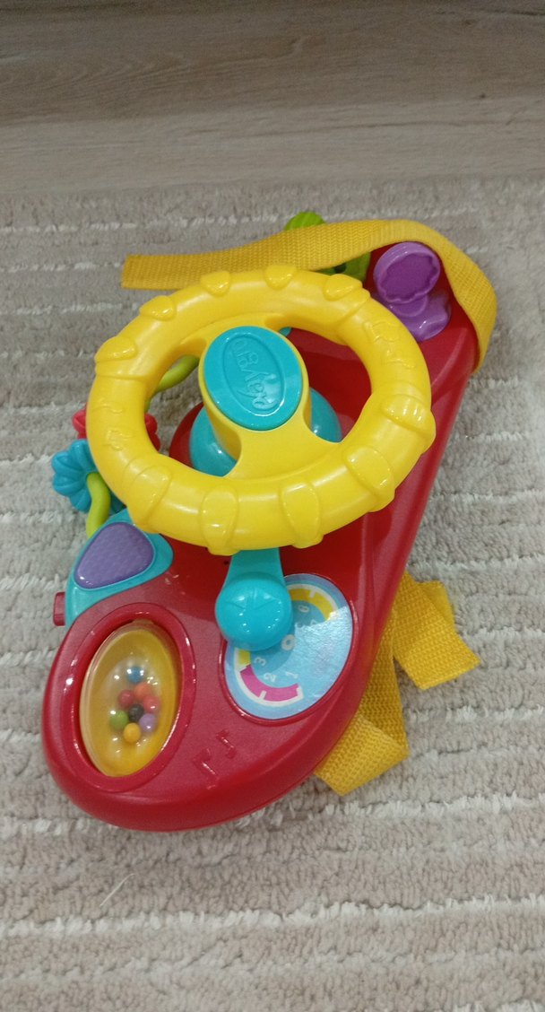 Etkileşimli direksiyon ve boncuk oyuncaklı renkli bebek . Kolay taşıma için sarı askısı bulunur.