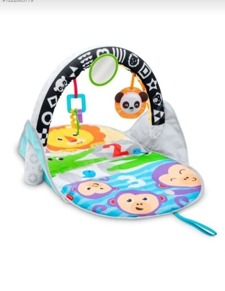 Yumuşak kumaşlı, asılı oyuncaklar ve ayna içeren renkli bebek oyun halısı. Bebekler için uygundur.