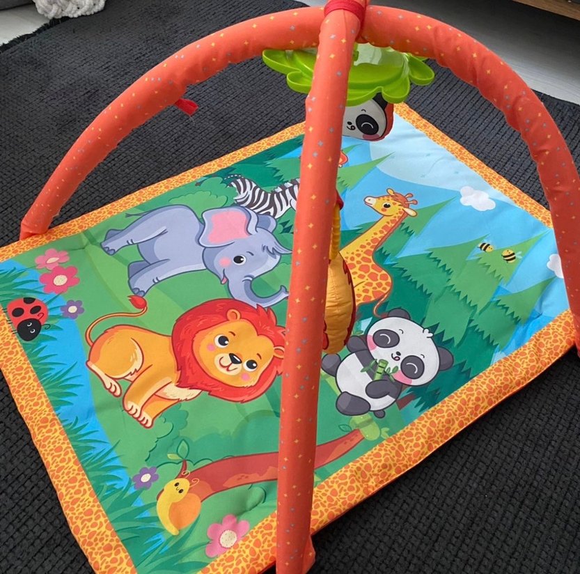 Hediye geldi kullanılmadı Yumuşak sentetik kumaştan yapılmış, hayvan desenli ve etkileşimli oyuncaklı renkli bebek oyun halısı. Bebekler için uygundur.