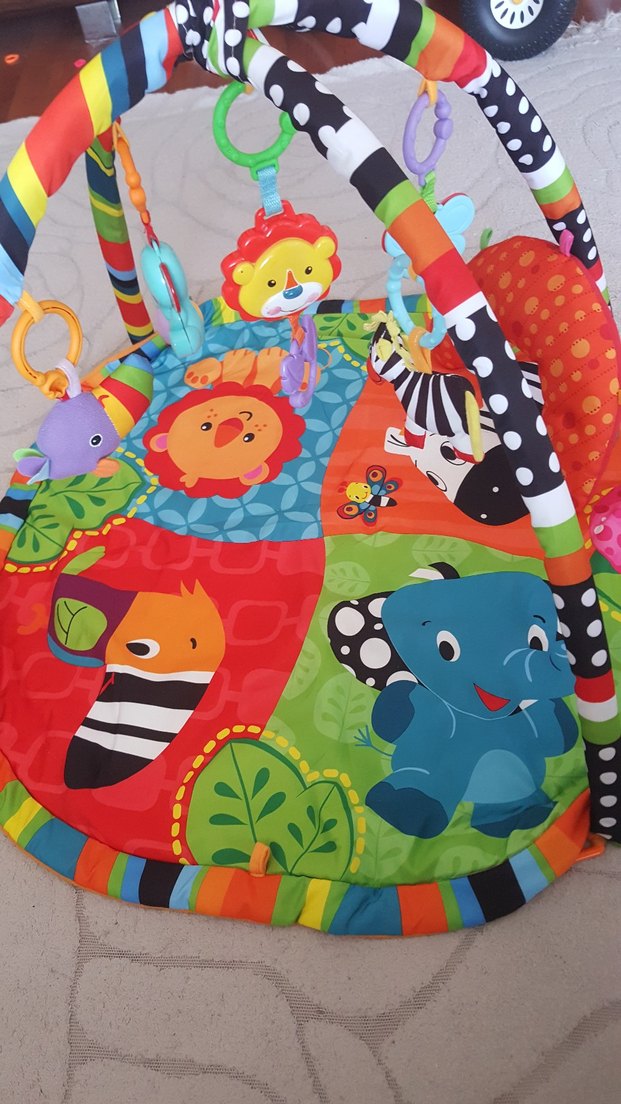 Yumuşak sentetik kumaştan yapılmış, hayvan figürlü asılı oyuncaklara sahip renkli bebek oyun halısı. Bebekler için uygundur.