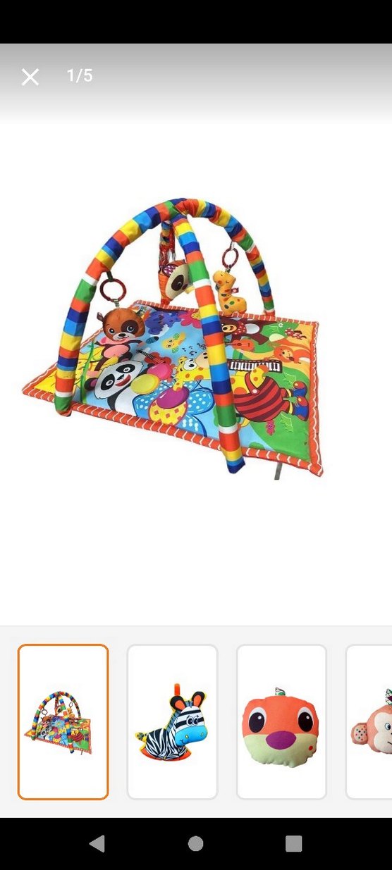 Sentetik kumaştan yapılmış, asılan oyuncaklar ve canlı hayvan desenleriyle renkli bebek oyun halısı.