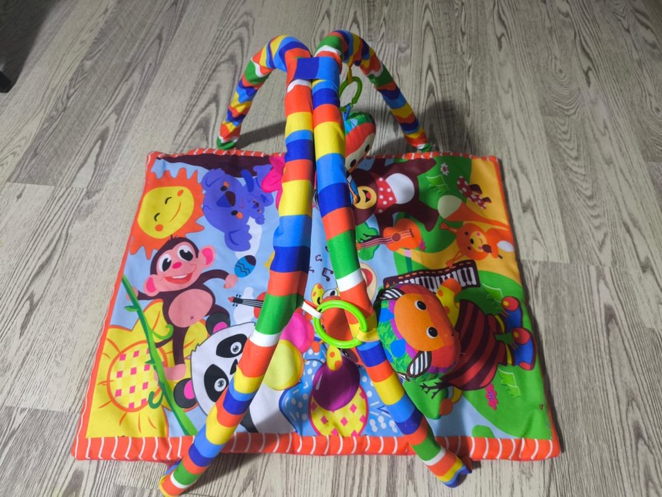 Renkli, sentetik kumaştan yapılmış bebek oyun halısı, asılı oyuncaklarla çocukların ilgisini çeker. Kusuru deformesi yok.