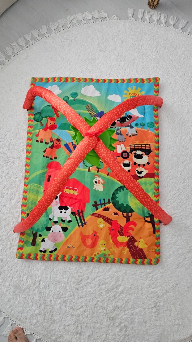 Yumuşak kumaşlı, çiftlik hayvanları desenli renkli bebek oyun halısı. bir tane oyuncağı kayıp ama yerine Baska oyuncak takılabilir Baska kusuru yok resimde görüldüğü gibi