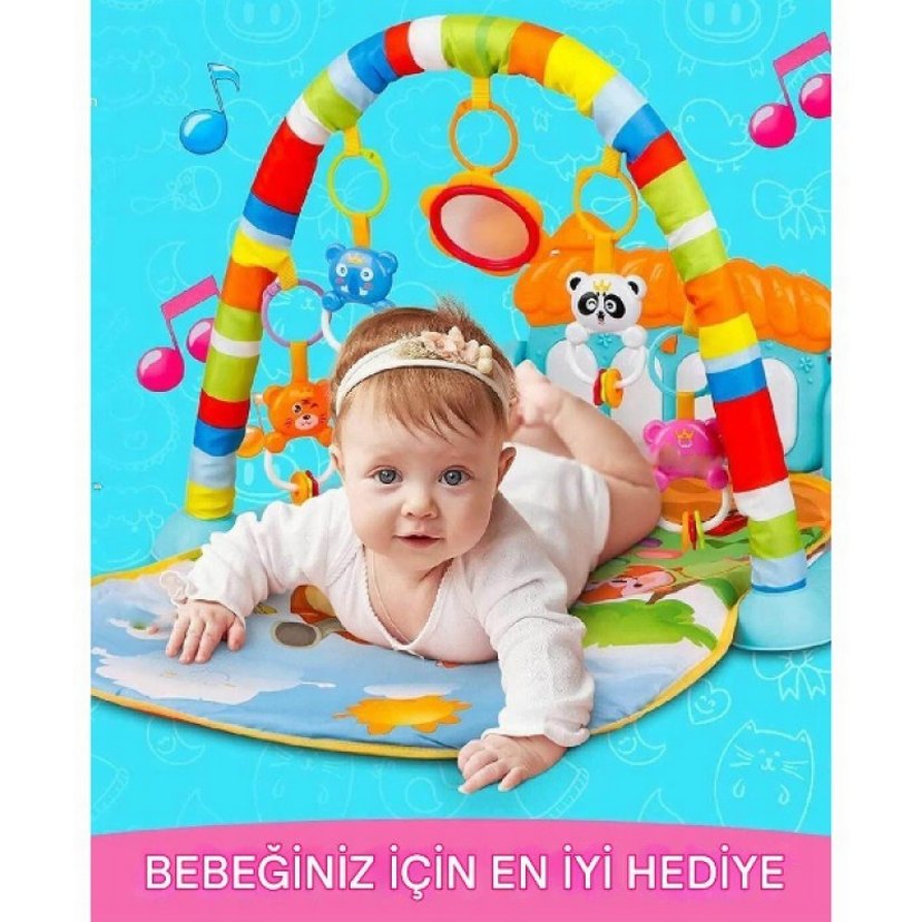 Renkli oyun halısı, asılı oyuncaklar ve yumuşak sentetik kumaş yüzeye sahiptir. Aynalı ve hayvan figürlü oyuncaklar içerir.