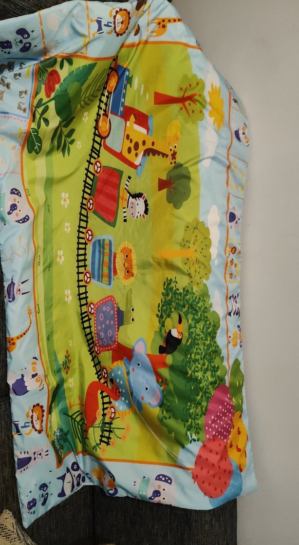 Sentetik kumaştan yapılmış, hayvan ve doğa desenleriyle renkli bebek oyun halısı.