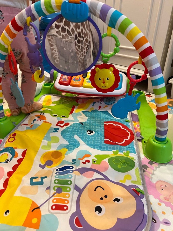 Çeşitli hayvan desenleri ve asılı oyuncaklar içeren plastik kemerli renkli bebek oyun halısı.
