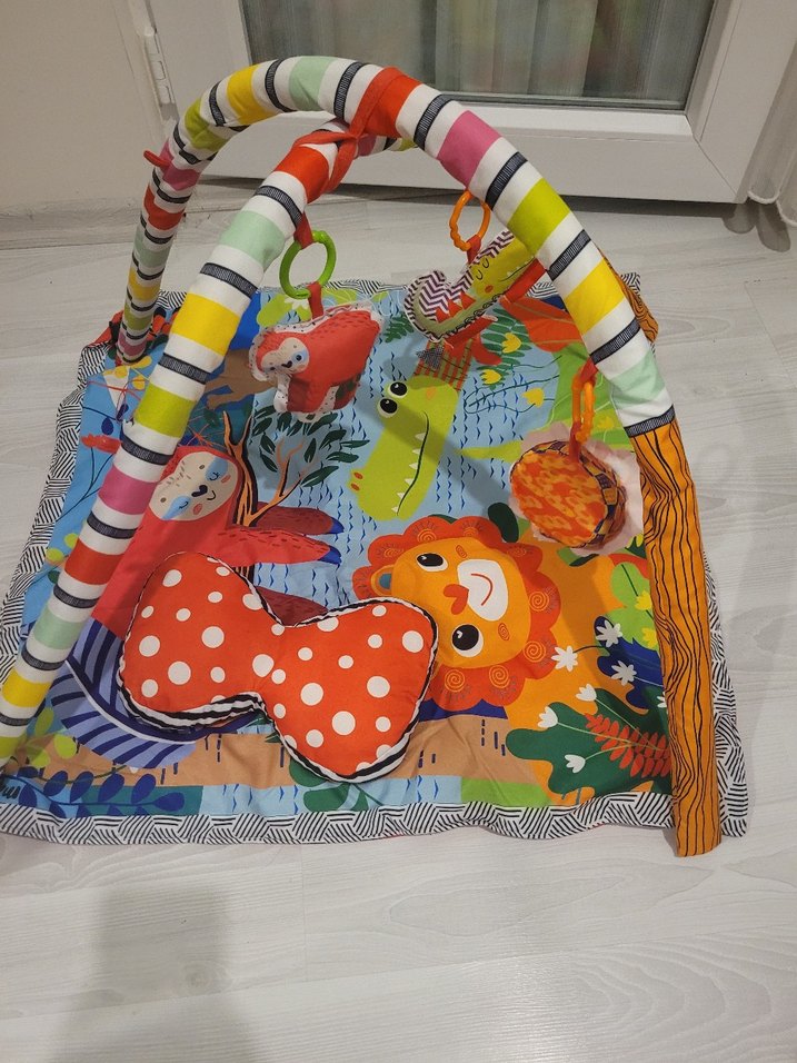 Yumuşak sentetik kumaştan renkli bebek oyun halısı, asılı oyuncaklar ve kemerlerle küçük çocukların ilgisini çeker. Tummy time yastığı içindedir.