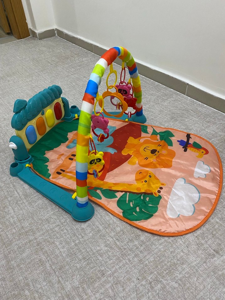 Renkli bebek oyun halısı, asmalı oyuncaklar ve plastik piyano klavyesi ile toddlerlar için tasarlanmıştır. Ürün sıfırdır hiç kullanılmadı.