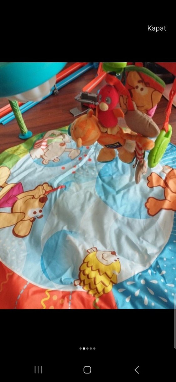 Yumuşak sentetik kumaştan yapılmış, renkli bebek oyun matı. Asılı peluş oyuncaklarla duyusal gelişime destek sağlar.