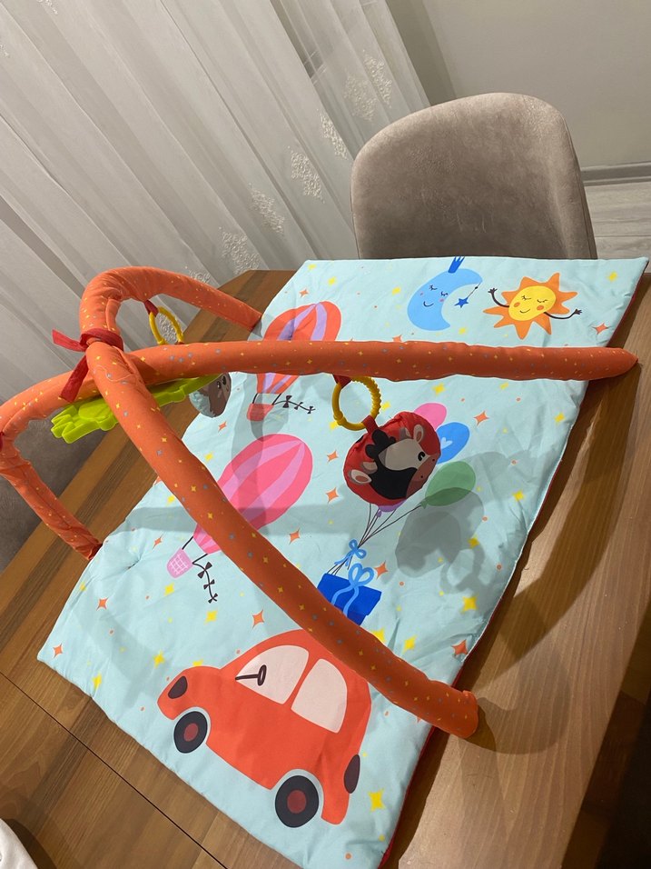 Yumuşak sentetik kumaştan yapılmış, renkli ve oyuncaklı bebek oyun matı