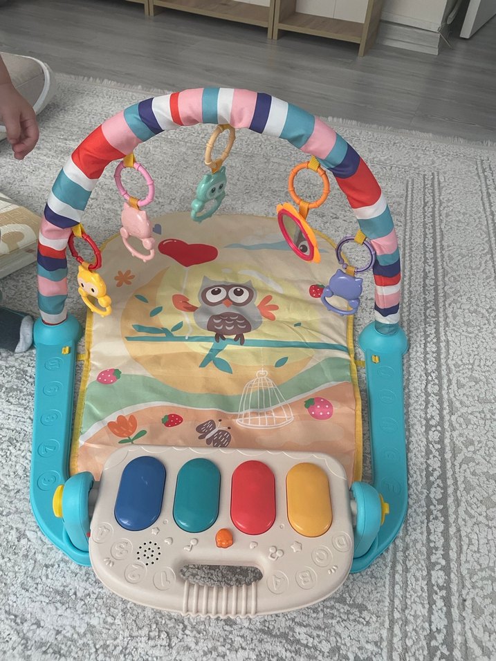 Plastik malzemeden yapılmış, renkli bebek oyun matı. Asılı oyuncaklar ve küçük piyano tuşları içerir. Temizdir yırtıklık yok pil zayıfladı değiştirmedim içinde pil gönderilmez
