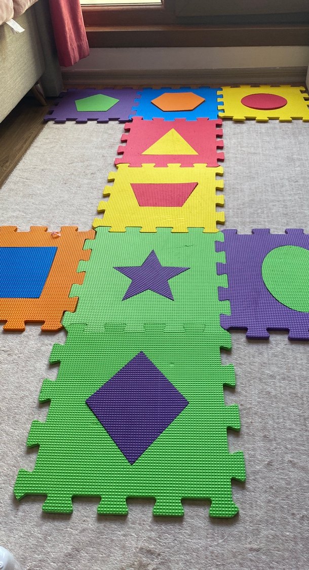 Çocukların oyun ve keşif yapması için çeşitli şekiller içeren renkli plastik bebek oyun matı.