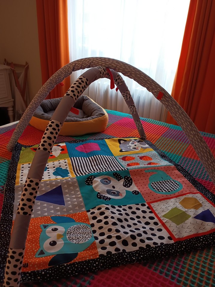 Sentetik kumaştan yapılmış, renkli hayvan desenli ve çocuk aktiviteleri için yumuşak kemerli bebek oyun minderi. oyuncak bulunmamaktadir