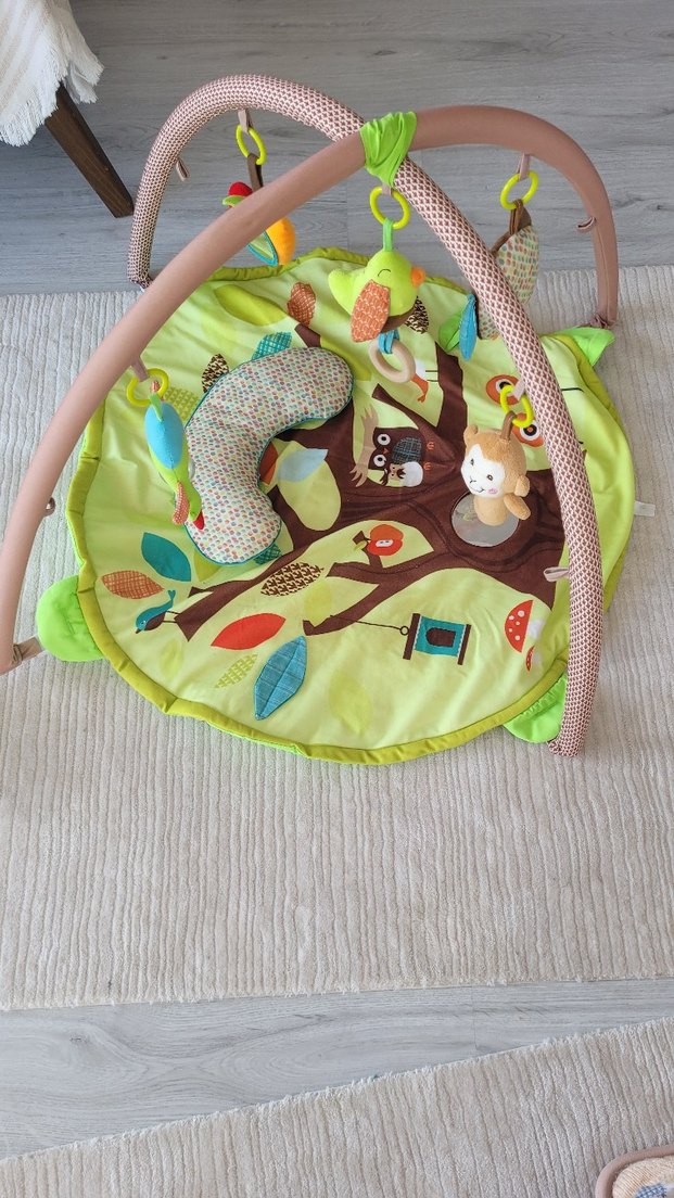 Yumuşak sentetik kumaştan, asılabilir oyuncaklı renkli bebek oyun minderi. Bebekler için uygun.