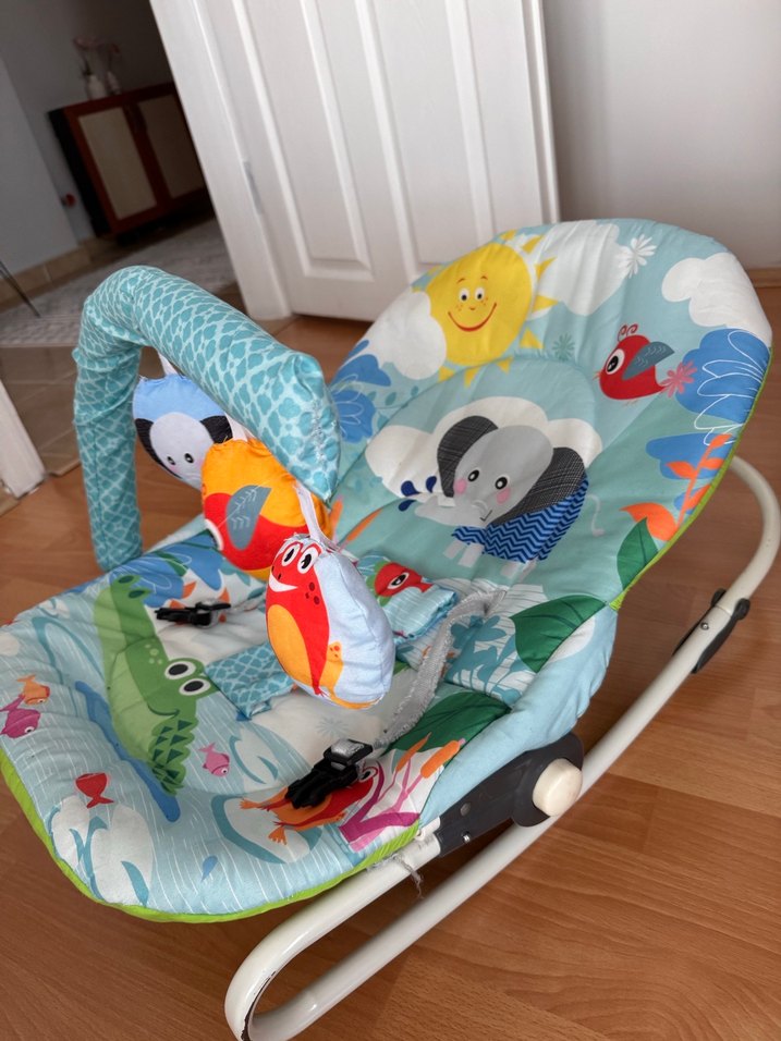 Yumuşak sentetik kumaştan yapılmış, hayvan ve doğa desenli renkli bebek oyun minderi. Minder ve asılı oyuncaklar içerir.