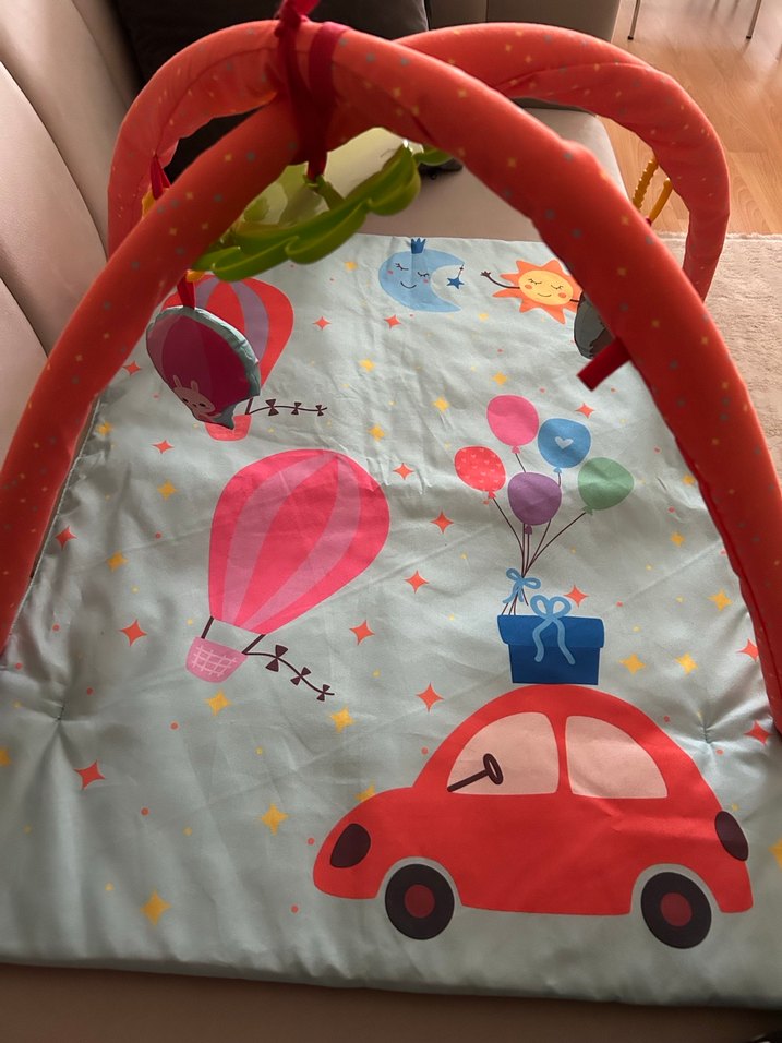Hiç kullanılmadı her hangi bir deforme yoktur Yumuşak sentetik kumaştan yapılmış, renkli bebek oyun minderi. Balonlar ve arabalar gibi eğlenceli desenler ve asılı oyuncaklar içerir