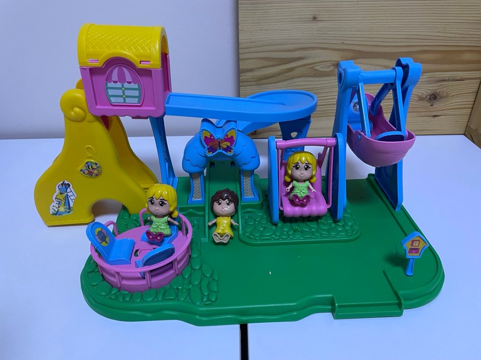 Renkli oyun seti, kaydırak, salıncak ve küçük bebekler içerir, yeşil taban üzerinde hayal gücünü destekler.