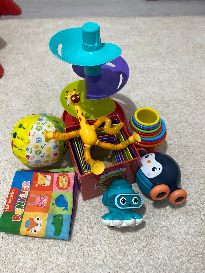 (KAYDIRAK DAHİL DEĞİLLL!!)Yığınlanabilir bardaklar, spiral kaydırak, top ve hayvan temalı oyuncaklar içeren renkli bebek oyuncak seti Hepsinin toplam fiyatı .(penguen araba satıldı o dahil değil)
